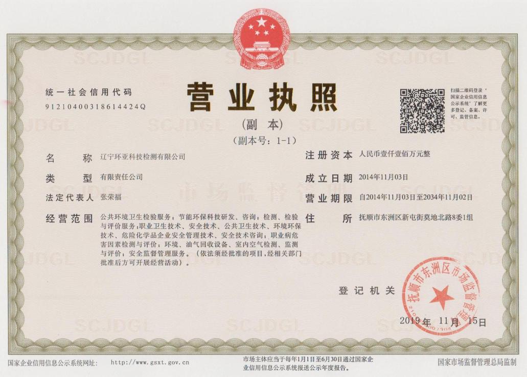 遼寧環亞科技檢測有限公司秉承“公平、公正、客觀、真實”的服務理念,力求為遼寧省各企事業等用人單位提供更優質的服務,公司領導率領全體員工歷時一年零八個月的時間操練各項基本技能,于2016年8月9日取得了(遼)安職技字(2016)第B-0019號《職業衛生技術服務機構資質證書》